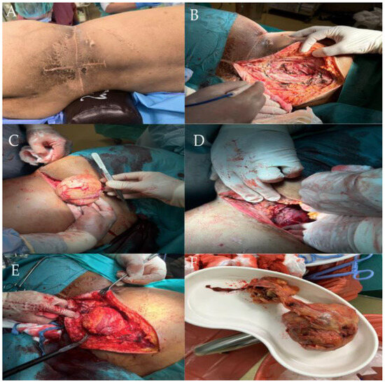 Intraoperative view showing the left lateral retroperitoneal tumor during exposure. The tumor is partially visible within the surgical field (A). Close-up of the left retroperitoneal tumor during resection, highlighting its dense and fibrotic structure (B). Advanced stage of dissection in the left retroperitoneal region, revealing tumor adherence to adjacent tissues (C). Completely resected tumor mass from the left retroperitoneal space, with irregular margins visible (D). Post-resection surgical field showing the cavity left by the removed tumor (E). Resected tumor mass (F).