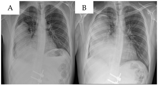 Chest X-Rays performed a one-month interval showing progression of lung metastasis. (A,B).