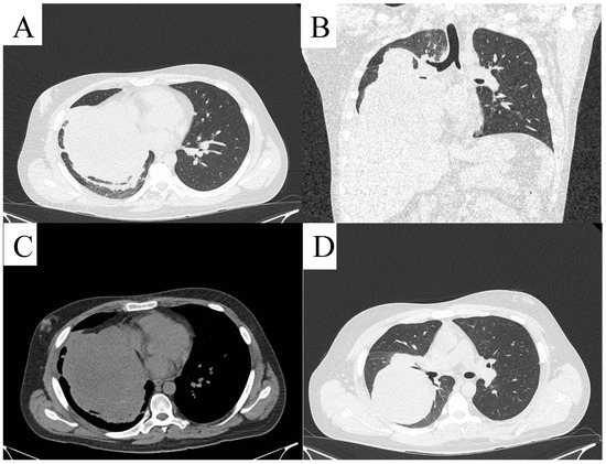 Chest CT: axial plane (A,C,D), coronal plane (B) heterogeneous density lesion of the right lung lobule with displacement of mediastinal structures.