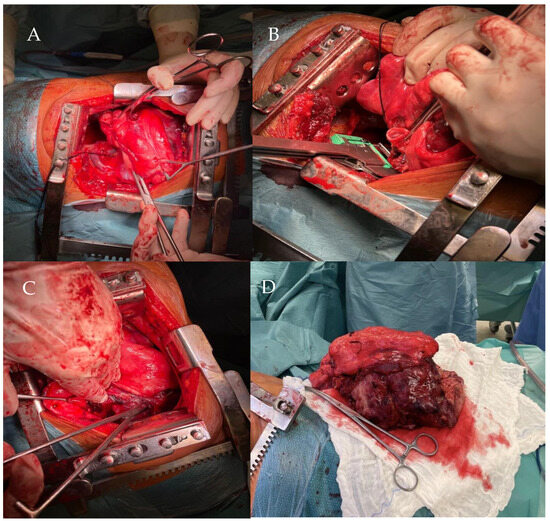 Following this diagnosis, the patient was admitted to the Department of Thoracic Surgery and Transplantation, presenting with a chronic cough accompanied by expectoration of white sputum, dyspnea, heartburn, intermittent tachycardia, and right shoulder pain. A right-sided pneumonectomy followed by a mediastinal lymphadenectomy was performed. A tumor measuring 220 × 130 mm was identified. Subsequently, the right branch of the pulmonary artery was isolated, ligated, and transected. The right main bronchus was severed with a stapler, after which the esophagus was dissected from the tumor. The pericardial sac was opened from the front and the isolated superior pulmonary vein was fixed with a stapler. The inferior pulmonary vein was severed with a stapler and the tumor was dissected from the mediastinum together with the severed phrenic nerve. The tumor was detached from the diaphragm and removed. In addition, lymph nodes 4R, 7, 10R and the diaphragmatic infiltrate through the tumor, and a fragment of the parietal pleura was removed. (Figure 7). After the surgery, the patient’s well-being improved, with no shortness of breath or coughing attacks. The pain in the right shoulder and arm subsided. There was only slight irritation in the throat.