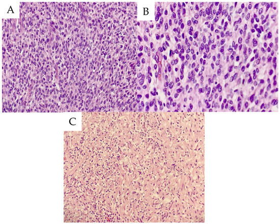 Histopathological specimens (representative hematoxylin–eosin stained histological images): (A) Spindle- and oval-shaped cells display a vague fascicular growth pattern with some perivascular accentuation. A moderate number of mitotic figures are present (original magnification ×200). (B) A high-power view of the spindle- and oval-shaped cells reveals a vague fascicular growth pattern (original magnification ×400). (C) A paratracheal nodule shows histological features of neurofibroma (original magnification ×200).