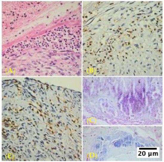 Infective endocarditis in mechanical heart valve tissue specimens in aortic position using different staining examined under high magnification (400×) using Olympus BX43 microscope and XC30 camera. The predominance of neutrophils in the inflammatory infiltrates provides valuable insights into the acute nature of the infection and the body’s immediate immune response. (A) Hematoxylin–eosin staining, inflammatory infiltrates with numerous neutrophils and tissue fibrosis. (B) MPO-positive neutrophil cells; numerous neutrophils are present in both the superficial fibrin network and subendocardial tissue of a mitral position mechanical heart valve. (C) Gram stain of Staphylococcus aureus PVE demonstrating Gram-positive cocci. Inconsistent staining patterns are frequently observed in tissue sections that have been Gram-stained. Gram 400× deparaffinization artifacts. Gram-positive microbial colonies; subendothelial conjunctive tissue; surface fibrin deposits; black–brownish deposit artifacts (D) Gram stain demonstrating Stahpylococcus aureus PVE; fine-grained blue structures arranged in clusters; (E) numerous MPO-stain-positive neutrophils (brown precipitate) in the subendocardial tissue of an aortic position mechanical heart valve.