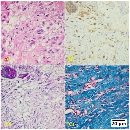 Histological examination of an aortic position mechanical valve tissue specimen with non-infective inflammatory degenerative lesions as visualized using different staining at 400× magnification with an Olympus BX43 microscope and XC30 camera. (A) Hematoxylin–eosin staining, inflammatory infiltrates with numerous macrophages. (B) CD68 staining showing inflammatory infiltrates with macrophages. (C) Masson Trichrome staining, marked interstitial fibrosis. (D) PAS staining showing inflammatory infiltrates with macrophages.