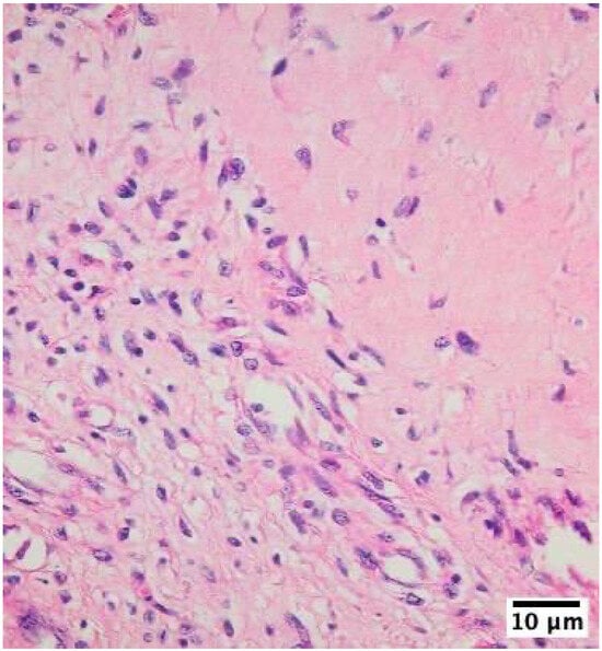 Histological examination of a mechanical heart valve tissue specimen in mitral position showed non-infective inflammatory degenerative lesions as visualized using hematoxylin–eosin staining at 400× magnification with an Olympus BX43 microscope and XC30 camera. This finding is characterized by the presence of numerous macrophages lining the area surrounding the mechanical valve. The accumulation of these immune cells suggests an ongoing inflammatory process, which may be a response to the presence of the artificial valve or a result of chronic tissue irritation.