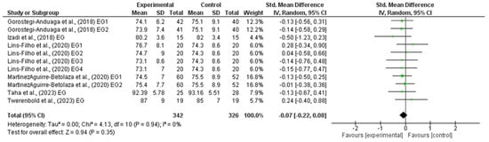 | Lins-Filho et al. (2020) [64] | EG1: 20 EG2: 20 EG3: 20 EG4: 20 | CG: 20 | Female | 65.3 ± 4.2 | 8 sessions | Treadmill | 10 sets of 1 min at 20%/30%/40% more than the SSEIwith 1 min of recovery at 20%/30%/40% less than the SSEI, or 5 sets of 2 min 80–95% VO2peak with 2 min of recovery at 40–50% VO2peak | EG1: ↔ EG2: ↔ EG3: ↔ EG4: ↔ | CG: ↔ | EG1: ↔ EG2: ↔ EG3: ↔ EG4: ↔ | CG: ↔ | NR | SSI and %VO2peak | Changed the degree and speed as the subject desired. |