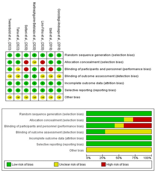 - Sterne, J.A.C.; Savović, J.; Page, M.J.; Elbers, R.G.; Blencowe, N.S.; Boutron, I.; Cates, C.J.; Cheng, H.Y.; Corbett, M.S.; Eldridge, S.M.; et al. RoB 2: A Revised Tool for Assessing Risk of Bias in Randomised Trials. BMJ 2019, 366, l4898. [Google Scholar] [CrossRef] [PubMed]