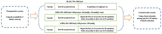 The intervention period lasted for eight weeks, with training sessions held three times weekly, encompassing exercises such as leg press, knee extension, and knee flexion. Throughout the study, all participants were instructed to maintain a controlled diet to ensure the precision and reliability of the research findings. The training process is shown in Figure 1. Prior to each training session, participants engaged in a standard 5 min warm-up. The HI-RT group utilized a load of 70% 1RM, with 1 min rest periods between sets. Each exercise was performed in three sets of eight repetitions.