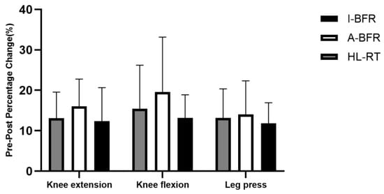 As demonstrated in Table 2 and Figure 2, within-group comparisons showed that the I-BFR, A-BFR, and HL-RT groups all exhibited significant increases (p < 0.01) in their leg press 1RM, knee flexion 1RM, and knee extension 1RM following the intervention, compared to their baseline values. When comparing between groups, no significant differences (p > 0.05) were found in these indices among the groups, and similarly, no significant differences (p > 0.05) were observed in the rates of muscular strength improvement post-training. Notably, the magnitude of maximal strength gain in the A-BFR group was slightly greater than that in the HL-RT and I-BFR groups.
