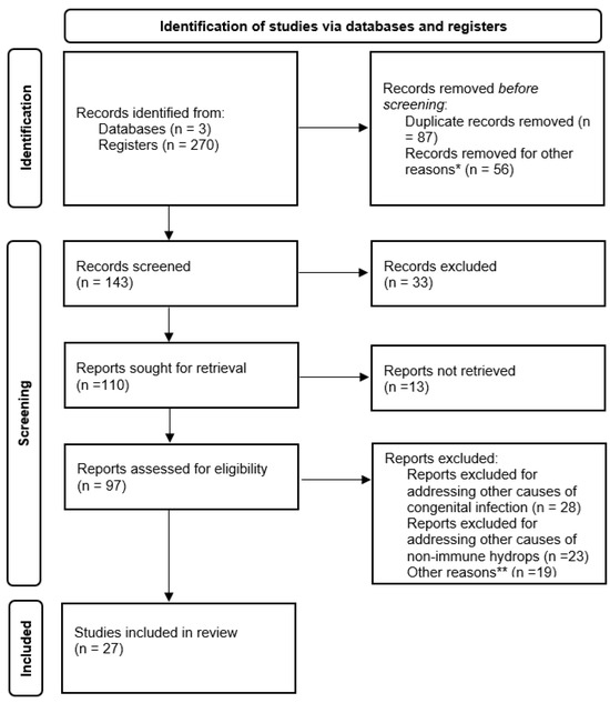 This study employed a narrative review methodology. For data collection, we searched the available online databases, PubMed, Cochrane Library, and Google Scholar, encompassing publications from January 2014 to December 2023, using the following keywords: Parvovirus B19 infection AND fetal transmission, Parvovirus B19 infection AND (congenital infection OR pregnancy OR fetal effects), Parvovirus B19 infection AND screening, Parvovirus B19 infection AND diagnosis, Parvovirus B19 infection AND management, Parvovirus B19 infection AND (non-immune hydrops OR fetal anemia OR miscarriage OR fetal death) (Figure 1). We also reviewed the references of the identified studies to enrich our knowledge on this topic. All data included in this narrative review have been prepared following the criteria in the PRISMA checklist. We have included cohort studies and case-report articles on pregnant women with confirmed parvovirus B19 infection. For the sections on ‘Taxonomy’ and ‘Epidemiology and transmission’, we included seminal papers and recent reviews to provide a comprehensive overview of the topic. Duplicate records identified across databases were removed. We included relevant non-peer-reviewed sources, such as government reports and conference proceedings, only when they provided unique information not available in peer-reviewed literature.