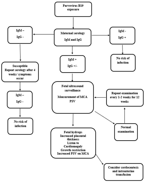 - Kielaite, D.; Paliulyte, V. Parvovirus (B19) Infection during Pregnancy: Possible Effect on the Course of Pregnancy and Rare Fetal Outcomes. A Case Report and Literature Review. Medicina 2022, 58, 664. [Google Scholar] [CrossRef] [PubMed] [PubMed Central]