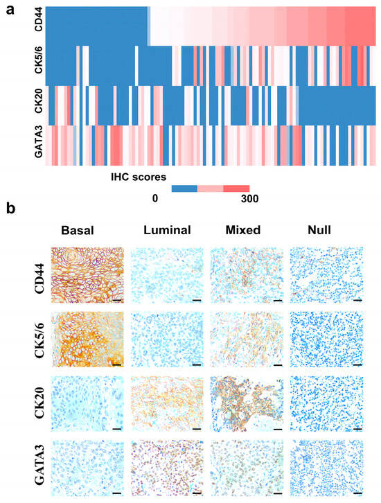 The immunohistochemistry expression of CD44, CK5/6, CK20, and GATA3. (a) The heatmap presented the immunoreactive of fours markers; (b) IHC stained with CD44, CK5/6, CK20, and GATA3 presenting representative molecular subtypes as basal, luminal, mixed, and null-types, the scale bar 50 μm.