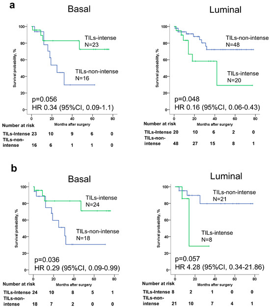 We found that the majority of luminal subtypes showed a non-intensive pattern of tumor-infiltrating lymphocytes (TILs) (Supplementary Table S2 and Table 2). In contrast, the basal subtype was more commonly associated with an intensive TIL pattern. To explore this further, we analyzed the relationship between TIL patterns and molecular subtypes in relation to overall survival. Our results indicated that basal subtypes with non-intensive TILs had a worse prognosis compared to basal subtypes with intensive TILs (Figure 2a,b). Interestingly, for the luminal subtype, patients with non-intensive TILs demonstrated a better prognosis compared to those with intensive TILs (Figure 2a,b).