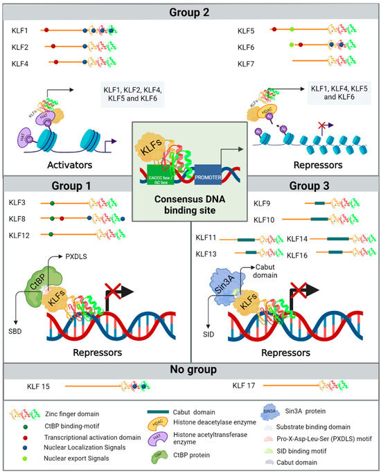 Different groups of KLFs based on their phylogenetic and structural characteristics of the amino-terminal region. (Group 1) includes KLF3, KLF8, and KLF12, whose primary function is transcriptional repression through interaction with the CtBP. (Group 2) comprises KLF1, KLF2, KLF4, KLF5, KLF6, and KLF7; these KLFs exhibit diverse activities and can function as either transcriptional activators or repressors. Finally, (Group 3) includes KLF9, KLF10, KLF11, KLF13, KLF14, and KLF16, which exert repressive effects similar to those of Group 1, but their action depends on their interaction with the transcriptional corepressor Sin3A. KLF15 and KLF17 are not assigned to a specific group because their protein interaction mechanisms are not yet fully explained, and they are also phylogenetically more distantly related.