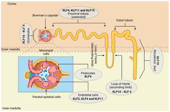 The basic structure of the nephron consists of a renal corpuscle and a renal tubule. The renal tubule is divided into several segments: the proximal tubule, where early solute reabsorption occurs to prevent accumulation and nephrotoxicity; the loop of Henle; the DCT; and finally, the collecting tubule, where urine is concentrated through coordinated processes of reabsorption and secretion. Knowledge of the location of the main cellular groups within the nephron is crucial to accurately identify the specific gene expression of KLFs. It has been shown that KLF10 is the most prevalent transcription factor in the glomerulus, inner medulla, thin ascending limb of the loop of Henle, and inner medullary collecting duct (IMCD). KLF4 follows KLF10, being detected in large quantities in both the glomerulus and loop of Henle. Additionally, KLF2, KLF4, and KLF11 are expressed in renal ECs.