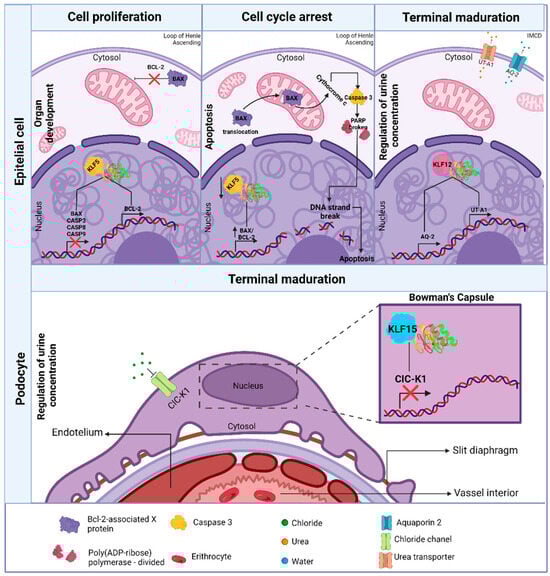 The specific expression of genes within each segment of the renal tubule determines its respective role [32]; unfortunately, the expression and function of KLFs in the subsequent segments of the nephron’s tubular system remain incompletely understood. Following the PCT, the loop of Henle consists of a thin descending limb, a thin ascending limb, and a thick ascending limb; it contributes to the regulation of urine concentration by passively reabsorbing water into the medullary interstitium. In the thin descending limb, 15% of water and potassium are reabsorbed, while sodium chloride (NaCl) is only modestly recovered. In contrast, in both the thin ascending limb and the thick ascending limb, approximately 25% of NaCl is reabsorbed. Urea reabsorption in the ascending limb of the loop of Henle increases solute concentration in the extracellular space. At the same time, its excretion is determined by glomerular filtration and tubular reabsorption, allowing it to play an important role in promoting concentrated urine production and maintaining water balance [58]. The distal convoluted tubule (DCT) performs the functions of reabsorbing sodium, potassium, and chloride, as well as secreting hydrogen and potassium ions. Finally, the collecting tubule, which reabsorbs the same electrolytes as the DCT, drains into the renal papillae [1,53].