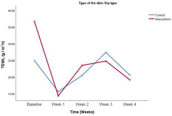 TEWL values change over the period of the study. Comparison between control and intervention group for the participants with the dry skin type.