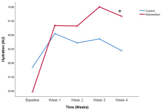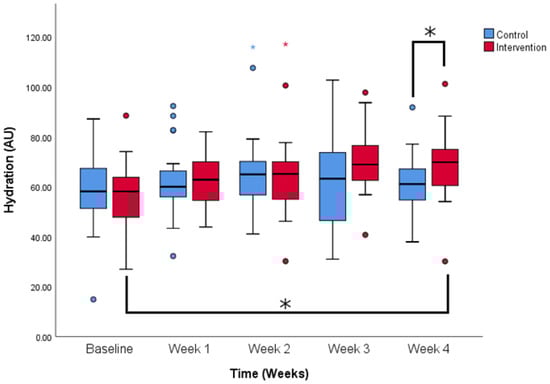 Hydration values were comparable at the beginning of the study (58.5 ± 14.9 vs. 56.4 ± 13.9 AU, control and intervention). Hydration values rose over time in both groups and the effect of time on hydration values is significant (p < 0.05). However, as seen in Figure 3, there is a significant difference between control and intervention at week 4 (61.0 ± 11.2 vs. 68.6 ± 13.3 AU, control and intervention). Participants who were using the tested serum had more hydrated skin at the end of the study (p < 0.05). Furthermore, there is a difference between the baseline value and the last measurement in the intervention group (p < 0.05) and there is no such difference in the control group.