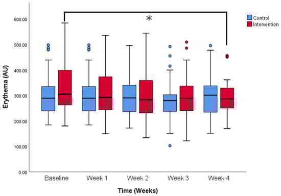 Erythema values change over the period of the study. Comparison between control and intervention group. * p < 0.05 (Two-way ANOVA for repeated measures with Bonferroni post-hoc test). Colored dots show less extreme outliers and colored stars more extreme outliers.