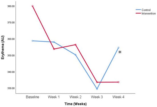 Baseline erythema values were slightly higher in the intervention group when compared to the control group, but the difference was not significant (310.5 ± 95.5 vs. 333.8 ± 107.9 AU, control and intervention). While values at the end of the study were comparable, there was a significant change between baseline erythema values and the last measurement on week 4 (333.8 ± 107.9 vs. 297.4 ± 77.4 AU, baseline values and week 4, intervention group). Erythema values decreased significantly for the group using the tested serum as Figure 6 describes (p < 0.05). There is no significant difference between any of the time points for the control group. Also, multivariate tests in ANOVA have shown that there is a significant effect of the intervention on the erythema values (Wilks’ Lambda test, p < 0.05) and the same test is insignificant in the control group.
