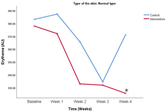 Erythema values change over the period of the study. Comparison between control and intervention group for participants who have normal skin type. * p < 0.05 (Two-way ANOVA for repeated measures with Bonferroni post-hoc test).