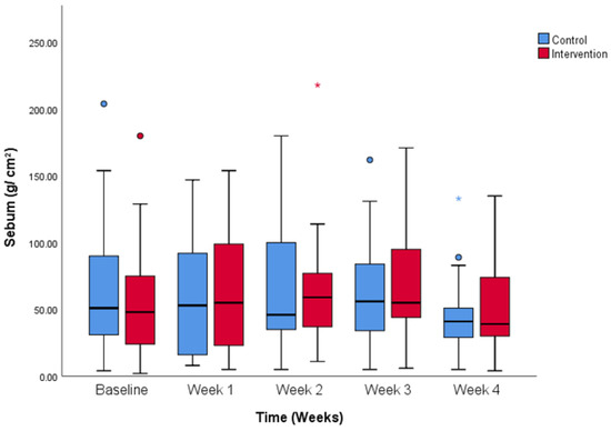 There is no significant difference in sebum values between the control and intervention group at the beginning of the study (63.2 ± 49.7 vs. 52.0 ± 41.1 g/cm2, control and intervention), nor at the end of the study (43.9 ± 28.2 vs. 50.4 ± 32.4 g g/cm2, control and intervention). Figure 9 shows that the change in sebum value is comparable between the groups across the study. The effect of time on value change is significant in both groups (p < 0.05).