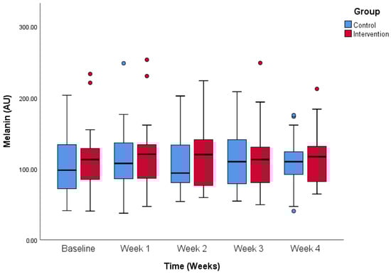 Melanin values were comparable between the groups over the period of the study as Figure 10 shows. Melanin values did not differ between the first (107.3 ± 41.6 vs. 113.8 ± 43.9 AU, control and intervention) and last measurement (109.5 ± 35.0 vs. 115.4 ± 39.9 AU, control and intervention).