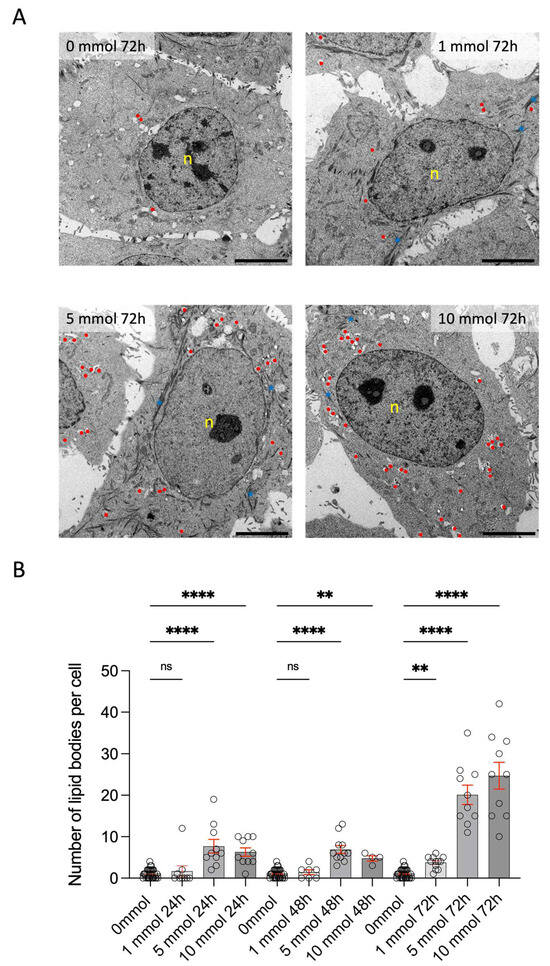 Morphology and lipid bodies. (A) Electron micrograph of stimulated hMGECs at different time points and concentrations. Red points = lipid bodies, n = nucleuls, scale bar = 5 μm. (B) Quantification of the percentage of lipid bodies at different time points and concentrations. Statistic is the mean + SEM, ns = not significant; ** p < 0.01, **** p < 0.0001, One-Way ANOVA (Kruskal–Wallis with Dunn’s test (uncorrected)).