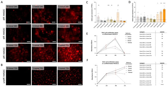 The differentiated hMGECs are characterized by the fact that they increasingly stop proliferating and instead increase lipid synthesis. The BRDU assay should show that the differentiation processes increase and the cells lose their ability to proliferate. The question arises as to what effect metformin has on the ability to proliferate. After 48 h, differentiated cell proliferation is significantly reduced at higher metformin concentrations of 5 mM and 10 mM compared to the control (Figure 2E). An amount of 1 mM showed no inhibitory effect compared to the control. No proliferation could be detected after 72 h.