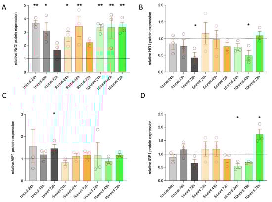 ELISA quantification of Nrf2 (A), HO-1 (B), AIF1 (C), and IGF-1 (D) of stimulated hMGECs. The raw data were normalized relative to the expression of the control (relative to control = 1, above 1 mean upregulated, below 1 means downregulated), statistic is the mean +/− SEM relative to the mean of the control (n = 3); * p < 0.05, ** p < 0.01 One-Way ANOVA (Kruskal–Wallis with Dunn’s test (uncorrected)).