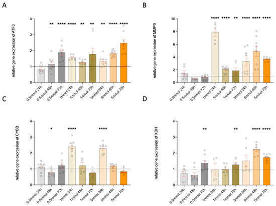 Expression of cell and oxidative stress marker of ATF3 (A), MMP9 (B), CYBB (C) and XDH (D). Diagrams showing the differences in gene expression in hMGEC (n = 4). The data display the mean ± SEM from n = 4 per group. The raw data were normalized relative to the expression of the control (relative to control = 1, above 1 mean upregulated, below 1 means downregulated), * p < 0.05, ** p < 0.01, **** p < 0.0001 One-Way ANOVA (Kruskal–Wallis with Dunn’s test (uncorrected)).