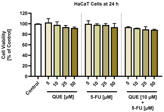 With regards to the impact of QUE, 5-FU, and QUE+5-FU on the viability of a healthy skin-derived cell line, HaCaT, the results illustrated in Figure 2 indicate that neither one of the tested compounds, nor their combinatorial treatment, caused cytotoxicity after 24 h of treatment. The HaCaT cells maintained over 85% viability in the case of all applied treatments, despite the observed concentration-dependent viability loss. As previously mentioned for A375 cells, neither solvent, DMSO or ultrapure distilled water, had any impact on the HaCaT cell viability; this was the reason why the data were normalized to the control (untreated cells).