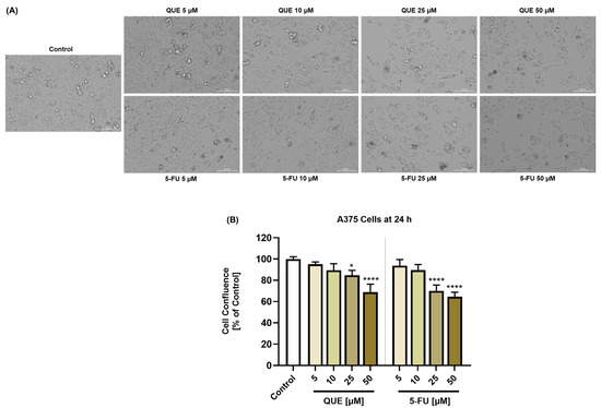 (A) Representative images of the morphology of A375 cells treated with quercetin (QUE) or 5-fluorouracil (5-FU) in the amount of 5, 10, 25, or 50 µM for 24 h. Scale bars = 100 µm. (B) Graphical representation of the confluence of A375 cells treated with quercetin (QUE) or 5-fluorouracil (5-FU) in the amount of 5, 10, 25, or 50 µM for 24 h. The graphs present the cell confluence (normalized to the control). The data are presented as the mean ± standard deviation of three experiments that were performed in triplicate. The statistical analyses performed were a one-way ANOVA and Dunnett’s multiple comparisons post-test. Statistically significant results are marked with “*” (* p < 0.05; **** p < 0.0001).
