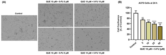 (A) Representative images of the morphology of A375 cells treated with quercetin (QUE) 10 µM + 5-fluorouracil (5-FU) in the amount of 5, 10, 25, or 50 µM for 24 h. Scale bars = 100 µm. (B) Graphical representation of the confluence of A375 cells treated with quercetin (QUE) 10 µM + 5-fluorouracil (5-FU) in the amount of 5, 10, 25, or 50 µM for 24 h. The graphs present the cell confluence (normalized to the control). The data are presented as the mean ± standard deviation of three experiments that were performed in triplicate. The statistical analyses performed were a one-way ANOVA and Dunnett’s multiple comparisons post-test. Statistically significant results are marked with “*” (** p < 0.01; *** p < 0.001; **** p < 0.0001).