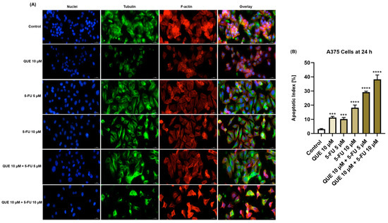 (A) Representative images of the nuclei, tubulin, and F-actin fibers in A375 cells treated with quercetin (QUE)—10 µM, 5-fluorouracil (5-FU)—5 or 10 µM, or their combination for 24 h. Scale bars = 30 µm. (B) Graphical representation of the calculated apoptotic index values in A375 cells treated with quercetin (QUE)—10 µM, 5-fluorouracil (5-FU)—5 or 10 µM, or their combination for 24 h. The data are presented as the mean ± standard deviation of three experiments that were performed in triplicate. The statistical analyses performed were a one-way ANOVA and Dunnett’s multiple comparisons post-test. Statistically significant results are marked with “*” (*** p < 0.001; **** p < 0.0001).