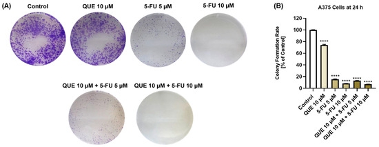 (A) Representative images of the formed A375 cell colonies following a 24 h treatment with quercetin (QUE)—10 µM, 5-fluorouracil (5-FU)—5 or 10 µM, or their combinatorial treatment. (B) Graphical representation of the colony formation rates in A375 cells treated with quercetin (QUE)—10 µM, 5-fluorouracil (5-FU)—5 or 10 µM, or their combinatorial treatment for 24 h. The graphs present the colony formation rate (normalized to the control). The data are presented as the mean ± standard deviation of three experiments that were performed in triplicate. The statistical analyses performed were a one-way ANOVA and Dunnett’s multiple comparisons post-test. Statistically significant results are marked with “*” (**** p < 0.0001).