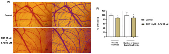 As presented in Figure 8, the treatment of CAM with the QUE (10 µM) + 5-FU (10 µM) combination produced a reduction in the total vessel area and the number of vascular branching points compared to the control, suggesting the in ovo antiangiogenic effect of this treatment.