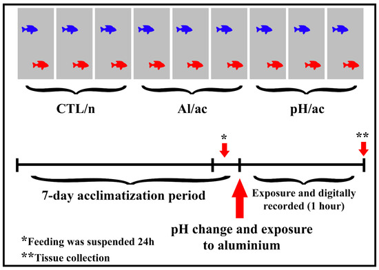 The experimental design was carried out using three experimental groups (in triplicate) (Figure 1): control in neutral pH (CTL/n group), acid pH (pH/ac group), and aluminum in acid pH (Al/ac group; 2.0 mg L−1). For the pH/ac group, the pH value was acidified with HCl (0.1 N) until 5.5 (mean); and CTL/n in neutral pH was set at 7.0 (mean). For the Al/ac group, the Al solution was obtained using aluminum sulfate (Al2(SO4)3; Sigma-Aldrich Diagnostic INS, St. Lous, MO, USA) from a stock solution prepared with Milli-Q water that was acidified to pH 2.5 with 65% HNO3 (Suprapur, Merck, Kenilworth, NJ, USA). As Al is insoluble at pH 6 to 8 [23], an Al group in neutral pH was not considered. Additionally, after adding Al solution in the Al/ac group (nominal concentration of 2.0 mg L−1), the pH was adjusted with HCl to 5.5 (average). Therefore, after the acclimation period, the animals (one couple) were transferred to aquariums (60 L each), involved in brown Ethylene-vinyl acetate (E.V.A.), except the front part of the aquariums, because all the interactions were digitally recorded (Everio FullHD JVC, Yokohama, Japan) during 1 h through this region of the aquarium. In this context, fish from different groups and replicas had no visual influence from one pair to the other and not even from people in the Bioterium. Additionally, behavioral records were made between 14:00 and 16:00 h to avoid possible circadian influences.