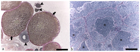Histological sections of Astyanax lacustris gonads. (a) mature female showing vitellogenic oocytes (arrow) and perinucleolar oocytes (arrowhead); (b) mature male showing several ducts full of sperm (asterisk). Stain: Schiff periodic acid (PAS)/iron-hematoxylin/metanil yellow. Bar: (a) 200 μm; (b) 100 μm.