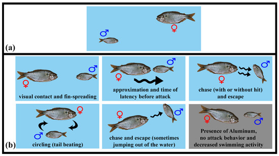 Evaluating the aggressiveness in Astyanax lacustris: (a) behavioral analysis of a couple in the experimental aquarium (60 L); (b) behaviors observed in A. lacustris (a couple, with a more aggressive female and bigger than the male) in experimental aquariums; the last gray box represents the aquarium with aluminum and “cloudy water”, and its main behaviors. For more information, see the text.