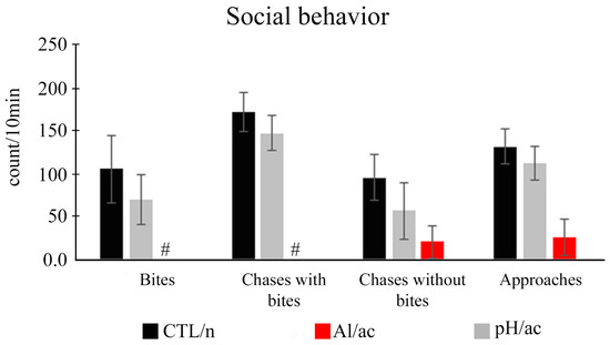 General social behavior of Astyanax lacustris females and males in different experimental groups: control (CTL/n) in neutral pH; aluminum in acid pH (Al/ac); acid pH (pH/ac). Number (based on 10 min) of bites, chases with bites, chases without bites, and approaches. Data are presented as the mean ± standard error of the mean (M ± SEM). # indicates no behavior in this group.