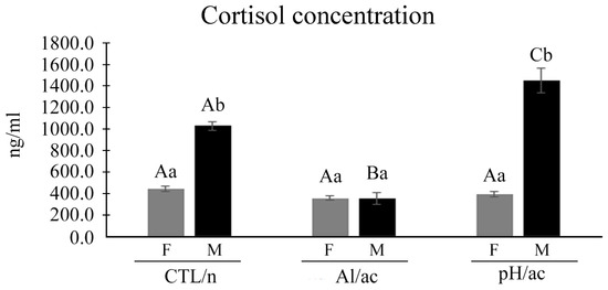 Plasma cortisol concentration in Astyanax lacustris female (F) and male (M) in different groups: CTL/n (control group in neutral pH); Al/ac (aluminum group in acid pH); pH/ac (acid pH group). Data are presented as the mean ± standard error of the mean (M ± SEM). A,B,C,a,b Different uppercase letters indicate differences between females and males in different groups (males in CTL/n (p < 0.011) and pH/ac (p < 0.001) groups compared with Al/ac group; pH/ac (p < 0.038) compared with CTL/n group), and lowercase letters indicate differences between females and males in the same group (CTL/n (p < 0.001) and pH/ac (p = 0.004) groups compared with Al/ac group). Data that were not statistically significant p > 0.05.