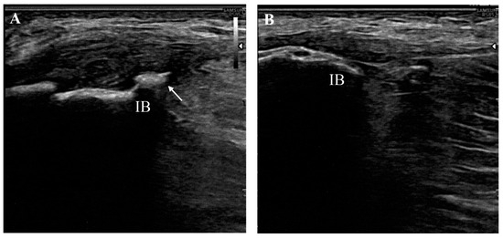 Long-axis image of a tendinopathic gluteus medius tendon (A) with contralateral healthy comparison (B) showing hypoechoic thickening at the attachment onto the iliac bone (IB) and irregularities of the bone margin due to the presence of an enthesophyte (arrow).