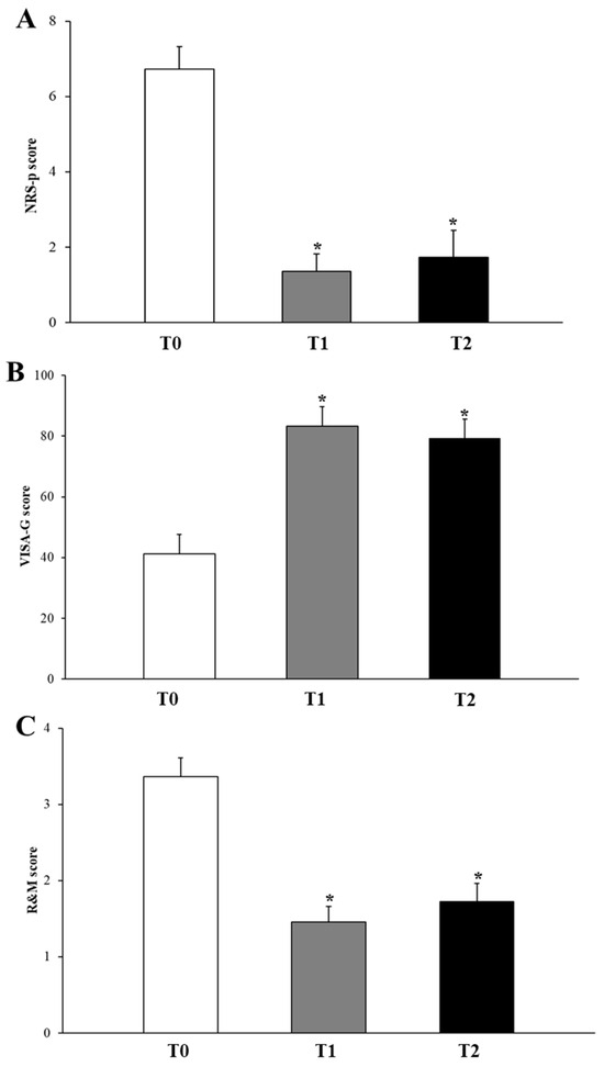 Average clinical outcome variations following c-SWT across time points of the study. NRS-p score (A), VISA-G (B), and R&M score (C). * p < 0.05 vs. T0.
