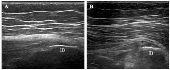Longitudinal views of the gluteus medius tendon from a patient in the study before (A) and after (B) combined ESWT. At baseline, the ultrasound image showed hypoechoic thickening at the tendon’s insertion onto the iliac bone (IB). Irregularities of the tendon’s superior contour were also evident. In contrast, a marked improvement in the morphological aspect of the tendon was evident at T2, as shown by the more homogeneous tendon fibrillar pattern and reduced thickness.