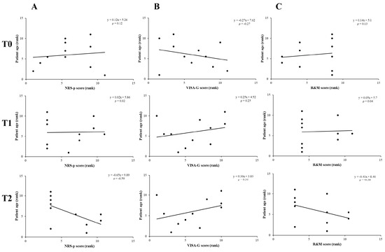 Linear correlation charts between outcome measures and patients’ age at different follow-ups following combined ESWT. NRS-p score (A), VISA-G score (B), and R&M score (C).
