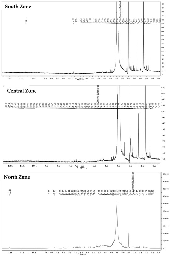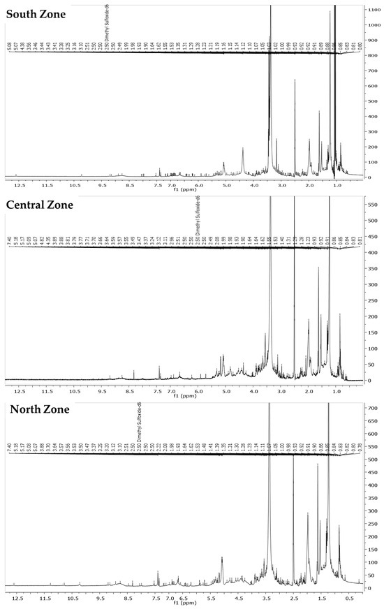 Comparison of 1H NMR (400 MHz, DMSO-d6) profiles of ethanolic extracts from the North, Central, and South Zones produced under specific extraction conditions.
