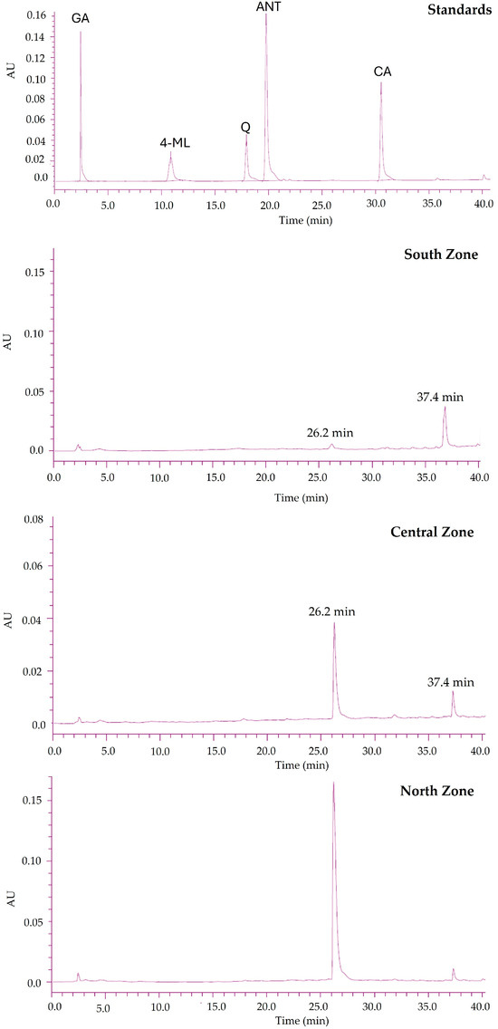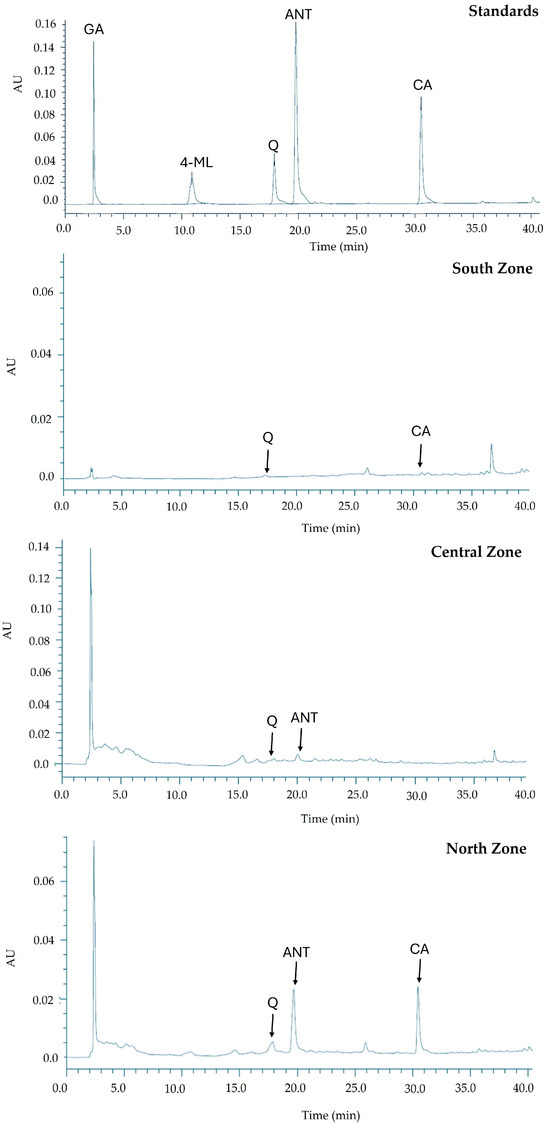 Comparison of HPLC chromatograms (290 nm) for the infusions analyzed at 2000 ppm from the three collection zones: North, Central, and South. The chromatogram of the standards includes gallic acid (GA; Rt: 2.385 min), cinnamic acid (CA; Rt: 30.795 min), anthrone (ANT; Rt: 20.000 min), quercetin (Q; Rt: 17.955 min), and 4-methylumbelliferone (4-ML; Rt: 10.908 min). All the standards (quercetin (Q), 4-methylumbelliferone (4-ML), anthrone (ANT), gallic acid (GA), and cinnamic acid (CA)) were injected at a concentration of 100 ppm each.