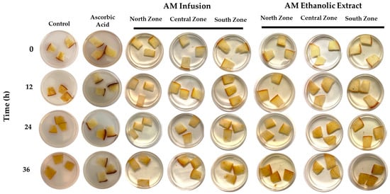 However, the ethanolic extracts from the North (12.19 ± 1.00) and especially the Central (20.81 ± 1.31) Zones exhibited significantly higher ∆E values, suggesting reduced antioxidant capacities or potential prooxidant effects. At 72 h, the browning was notably higher in the ethanolic extracts, with the Central Zone extract (32.23 ± 1.99) showing the highest ∆E, indicating a pronounced prooxidant trend. Conversely, ascorbic acid (7.55 ± 1.06) and the infusions from the North (14.56 ± 2.49) and South (14.94 ± 1.05) Zones continued to demonstrate moderate antioxidant capacity, maintaining lower browning levels compared to most of the other ethanolic extracts. These findings highlight the variability in antioxidant capacity among the treatments, with ascorbic acid remaining the most effective.