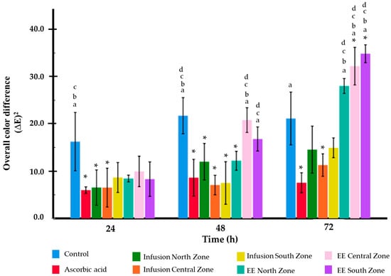 The overall color difference (∆E2) in the anti-browning assay of apple slices treated with the A. muricata ethanolic extracts (EEs) and infusions was evaluated. All the treatments were tested at a concentration of 0.5 mg/mL, with distilled water as the control and ascorbic acid (0.5 mg/mL) as a reference. The statistical analysis was performed using Tukey’s post hoc test: * statistically significant difference (p < 0.05) compared to the control; a statistically significant difference (p < 0.05) compared to ascorbic acid; b statistically significant difference (p < 0.05) compared to the infusion from the North Zone; c statistically significant difference (p < 0.05) compared to the infusion from the Central Zone; and d statistically significant difference (p < 0.05) compared to the infusion from the South Zone.