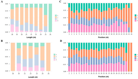 The frequencies of the first and the other bases of the miRNAs. (A,B) The first nucleotide base of the known and novel miRNAs, respectively. The X-axis represents the length of different miRNAs, and the Y-axis represents the percentage of frequency of a four-base distribution of miRNAs of different lengths. (C,D) The nucleotide bases of known and novel miRNAs at each position. The X-axis represents the bases of the miRNAs from 1 to 26, and the Y-axis represents the percentage of different base distributions at each position of the miRNAs.